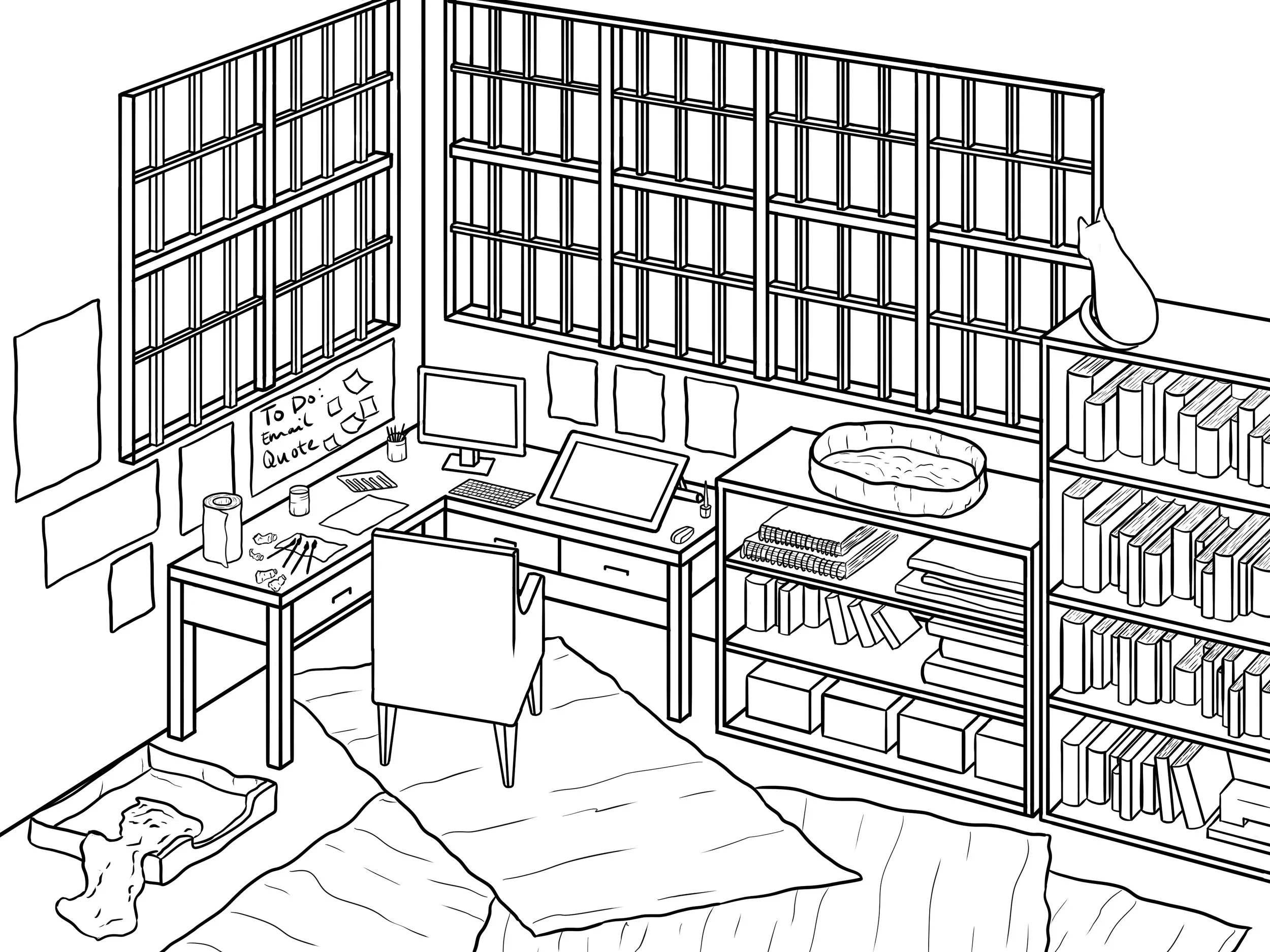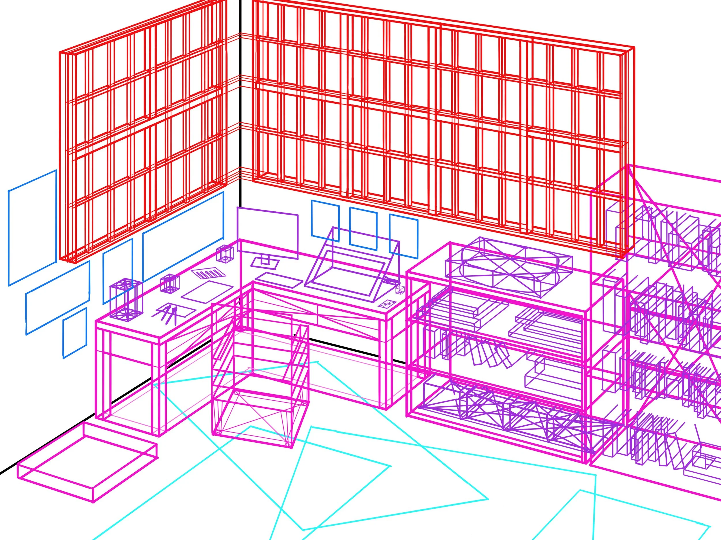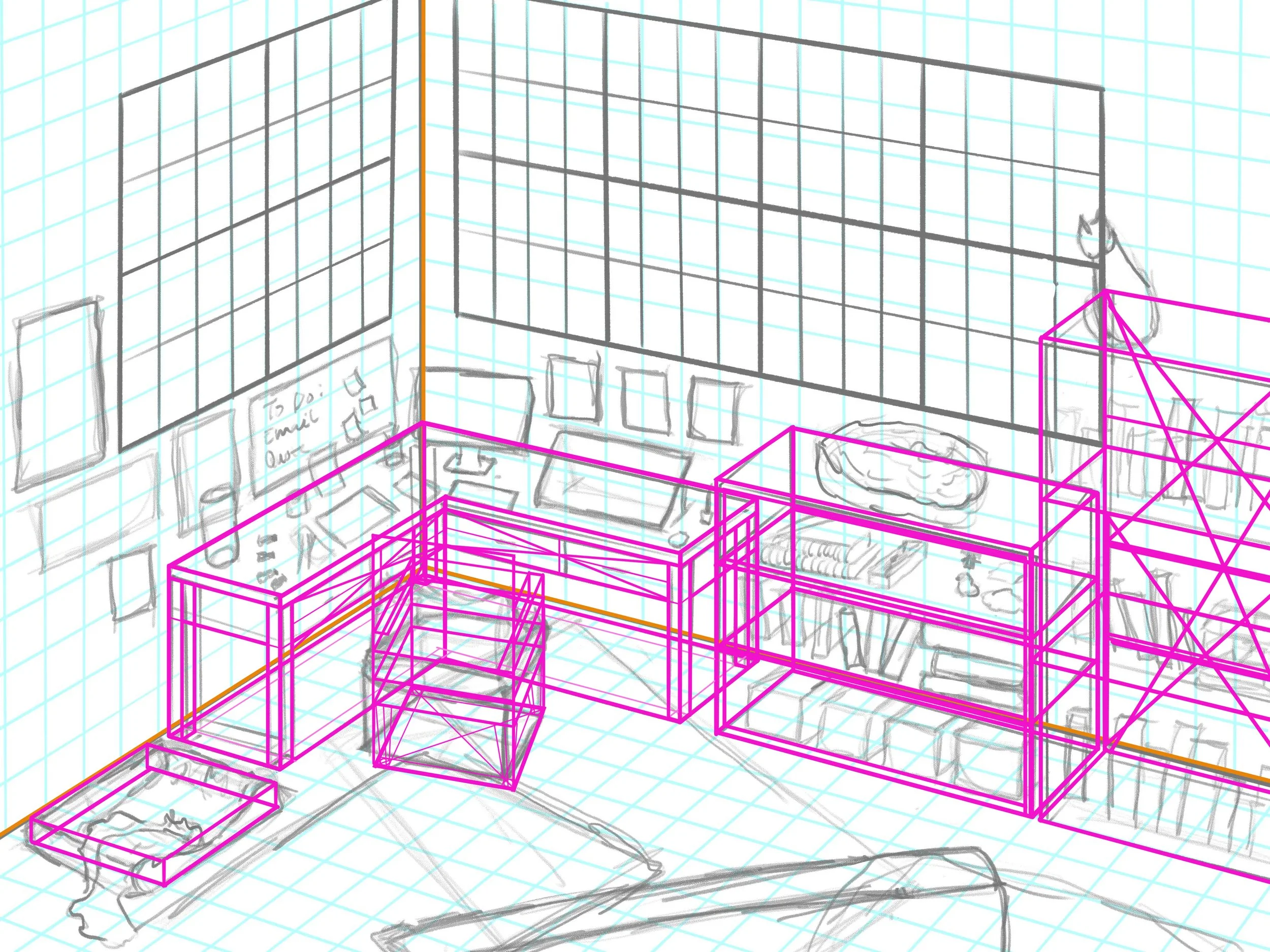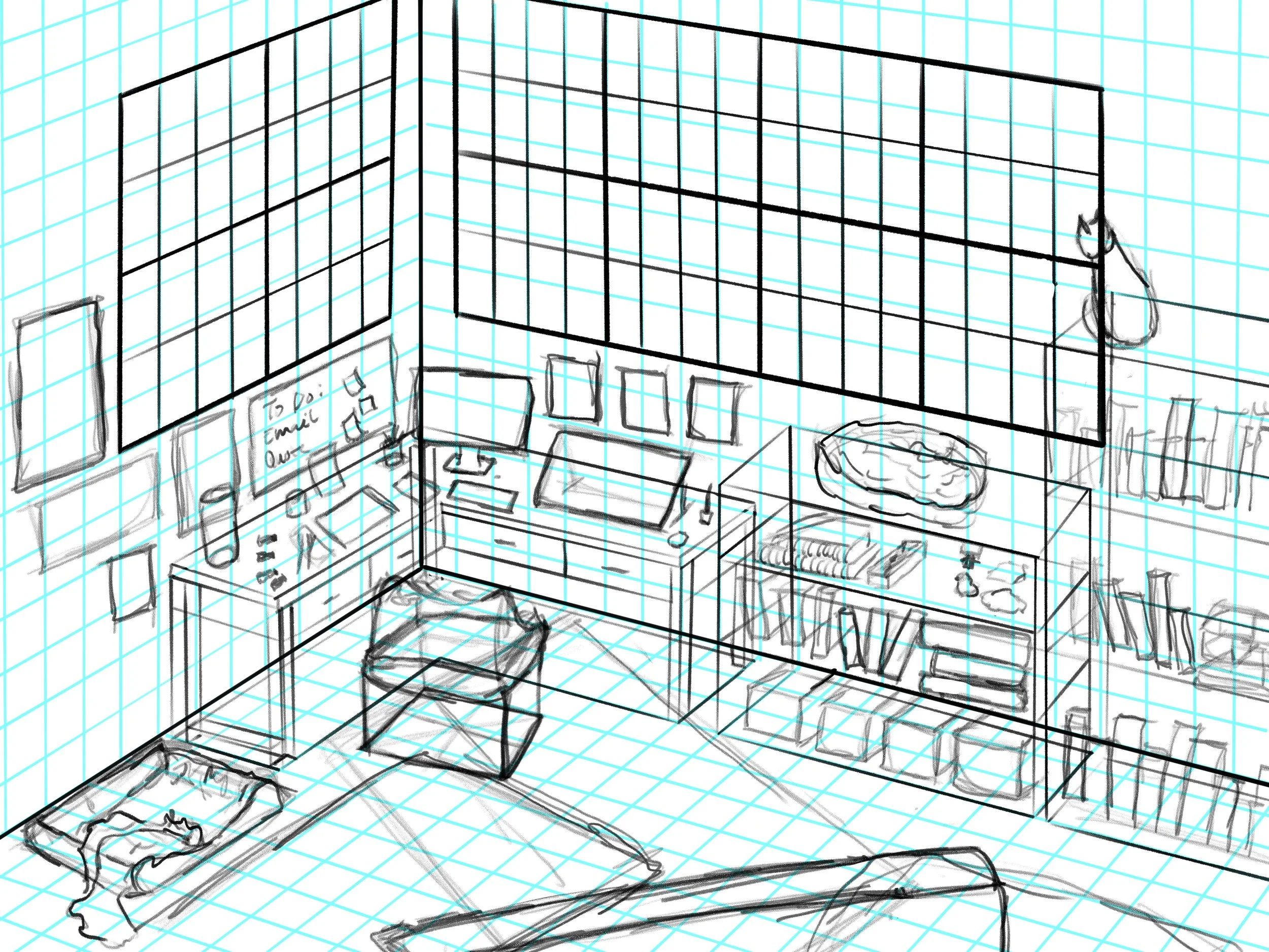 A digital illustration of my dream studio. Perspective drawing base. Clip Studio Paint and Photoshop/Fresco.