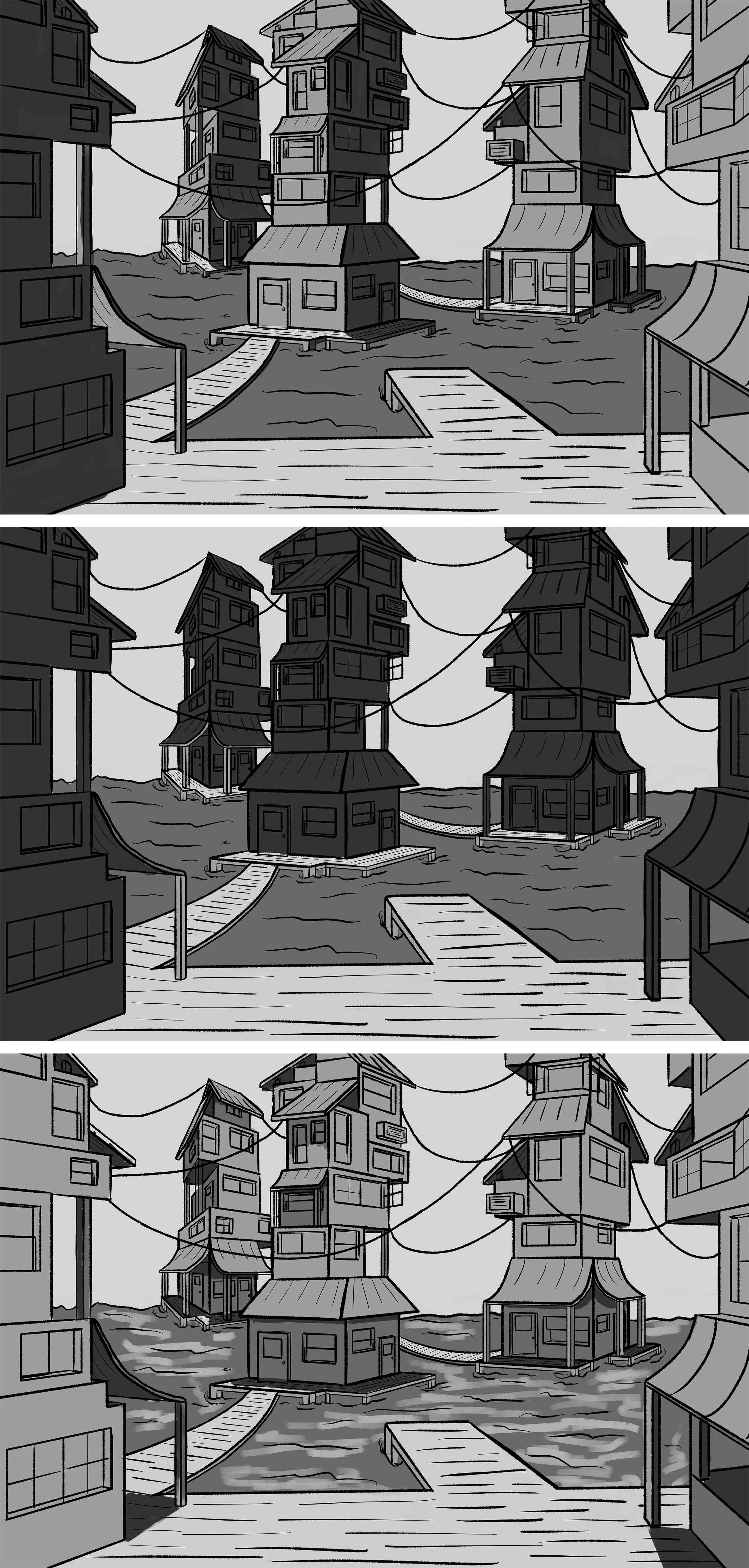 This is the new reworked linework for the Fishing Village. This is my concept for a village prompt. I thought of a sort of slum village on slits so they could be close to the water. Created digitally in Clip Studio Paint and Photoshop.